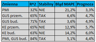 W przypadku indeksów GUS mówimy o dwóch wskaźnikach dotyczących przemysłu i budownictwa. Obydwa opisują ogólną sytuację gospodarczą przedsiębiorstw. Biorąc na warsztat te mierniki okazuje się, że nieco wyższą wartość predykcyjną ma indeks dotyczący sektora budowlanego. Model ten charakteryzuje się również najmniejszym błędem wśród analizowanych kombinacji. Na podstawie takiego rodzaju modelu wzrost w czwartym kwartale wyniósłby 4,9%. Niższą wartość prognostyczną (biorąc pod uwagę zwykłą regresję) miały wskaźniki dotyczące nastrojów w przemyśle i budownictwie autorstwa Komisji Europejskiej. Obecnie prognozy oparte o te wskaźniki sygnalizują wartości znacznie przekraczające 5%, co naturalnie jest mało realne. Może to wynikać z charakterystyki samych indeksów i metodologii zbierania danych.