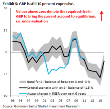 Goldman przyznaje również, że przyjęty przez nich konieczny poziom deprecjacji GBP może w istocie okazać się mniejszy. Możliwe jest również, że deficyt CA wcale nie będzie musiał skurczyć się tak bardzo, jeśli UK ostatecznie wypracuje bardziej przystępne warunki wyjścia z UE. Koniec końców, bank zaznacza, że pomimo już znaczących spadków wartości GBP, waluta UK (efektywny kursu uwzględniający udziały handlowe) jest wciąż przewartościowana o około 10%, jeśli normą w przyszłości będzie mniejszy deficyt CA. Konkluzją z całego wywodu są słowa, że funt nie jest jeszcze tani.