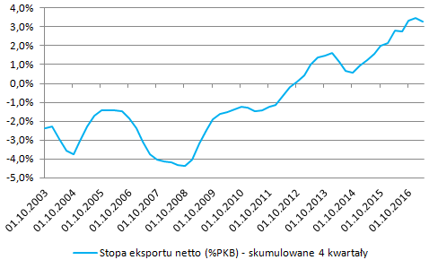 W takiej sytuacji niemiecki import polskich towarów wydaje się, że powinien przyspieszyć będąc jednocześnie czynnikiem wspierającym wzrost gospodarczy w czwartym kwartale. Zauważmy, że w drugim kwartale eksport netto odjął aż 1,5 pkt. proc. od PKB, niemniej jednak trzeba wskazać, że na przestrzeni ostatnich lat ta wielkość odgrywa coraz większą rolę w kreowaniu polskiego wzrostu gospodarczego, choć wciąż są to bardzo niewielkie ilości w porównaniu z konsumpcją czy nawet słabymi ostatnio inwestycjami.
