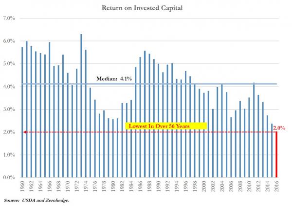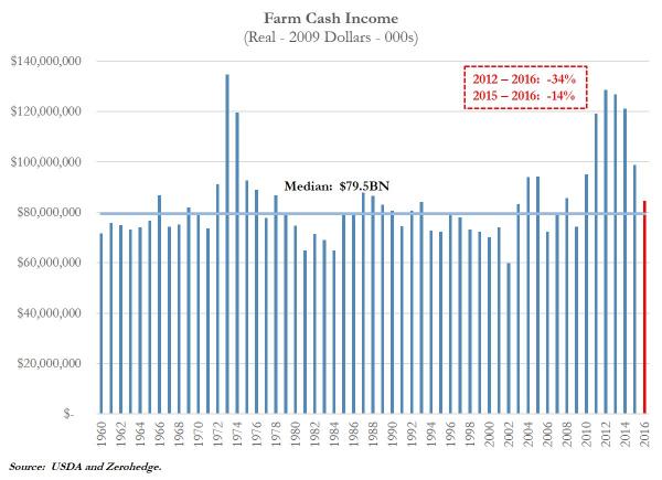 Jak widać na pierwszym wykresie w ostatnich latach odnotowywaliśmy dynamiczne spadki dochodów amerykańskich rolników. W całym 2016 roku figura ta ma spaść do poziomu poniżej 2010 roku, co stanowiłoby spadek rzędy -34% od ostatniego szczytu oraz spadek -14% w ujęciu rocznym.