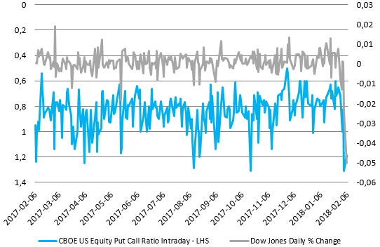 Inną kwestią jest zmienność, która rzecz jasna wystrzeliła, nie tylko ta bieżąca, ale również i ta antycypowana. Dla przykładu indeks VIX, zwany popularnie indeksem strachu, wzrósł podczas dzisiejszej sesji powyżej poziomu 50 punktów tj. najwyższego od sierpnia 2015 roku, kiedy to Ludowy Bank Chin zdecydował się nieoczekiwanie zdewaluować juana. Indeks ten obrazuje implikowaną zmienność na indeksie SP500 w horyzoncie kolejnych 30 dni. Ponadto, warto zwrócić również uwagę na inny miernik jakim jest Put/Call ratio autorstwa chicagowskiej giełdy CBOE. Prezentuje on stosunek ilości opcji dających prawo sprzedaży (Put) oraz kupna (Call) na SP500. Jasnym więc jest, że im wyższe poziomy wskaźnika, tym rośnie poziom zabezpieczania się przed przyszłymi, potencjalnymi spadkami.
