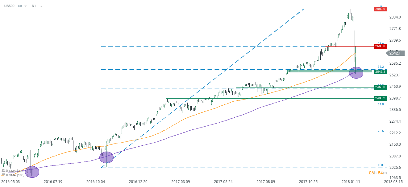 Na koniec rzut oka na wykres dzienny kontraktów CFD na indeks SP500, który sugeruje testowanie kluczowego poziomu obronnego dla strony popytowej. Mowa o 200-sesyjnej średniej kroczącej, która w 2016 roku również posłużyła jako wsparcie. W dodatku w miejscu tym przebiega zniesienie 38,2% całej fali zwyżkowej zapoczątkowanej od wyborów prezydenckich w USA w listopadzie 2016 roku. Tym samym wydaje się, że tak długo jak cena pozostanie powyżej tego pułapu, zaś na wykresie dziennym nie ujrzymy tzw. krzyża śmierci (przecięcie w dół 200DMA przez 100DMA), dopóty trend wzrostowy powinien pozostawać w grze. Aktualnie pierwszym oporem jest pułap 2680 punktów, którego przebicie umożliwiłoby kupującym próbę powrotu do historycznych szczytów.