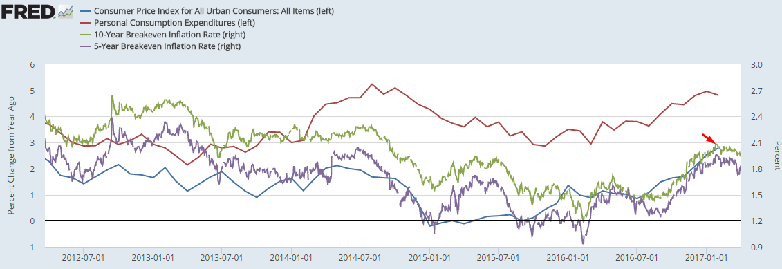 Z drugiej strony, patrząc na oczekiwania inflacyjne mierzone tzw. breakeven rates (różnica między nominalnymi rentownościami i rentownościami obligacji indeksowanych inflacją) możemy dostrzec, że trend reflacyjny powoli dobiega końca. Porażka Trumpa w zastąpieniu Obamacare rzuciła się cieniem na zdolność do przeprowadzenia reformy podatkowej. Poza tym efekt bazy z tytułu cen energii zanika obnażając słabość ostatniego odbicia inflacyjnego i potwierdzając, że w większości gospodarek miało ono charakter egzogeniczny.