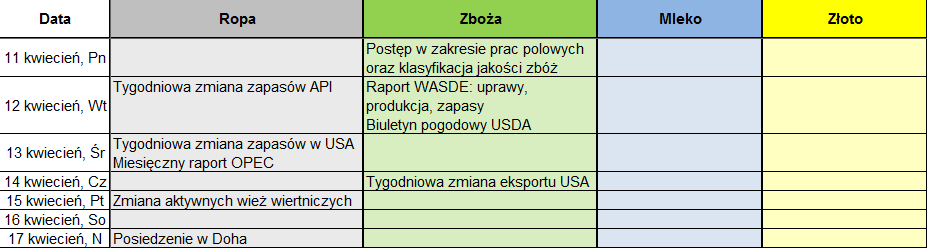 Obecny tydzień zapowiada się emocjonująca na rynku ropy naftowej oraz zbóż, z kolei w ciągu najbliższych dni nie poznamy żadnych fundamentalnych danych dotyczących rynku mleka (NZD) czy też złota. Prócz regularnych publikacji z rynku czarnego złota jakim są raport API, EIA i zmiana aktywnych wież według Baker Hughes, przed nami dwa, wybitnie ważne punkty. Już pojutrze OPEC opublikuje swój miesięczny raport dotyczące produkcji. Ostatnie ankiety Bloomberga jak i Reutersa wskazują na możliwy jej wzrost. Co więcej, według państwowego przedsiębiorstwa irackiego Oil Marketing Co. Exports kraj ten, który jest drugim z kolei pod względem wielkości wydobycia, zwiększył swoją podaż w marcu do rekordowych poziomów. Tak więc środowa publikacja powinna rozwiać wszystkie wątpliwości w tej kwestii.