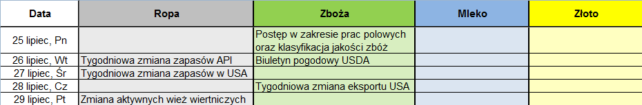 Z kolei tak jak wskazywałem na początku, najbliższy tydzień nie przyniesie wielu publikacji, stąd uwaga powinna skupić się przede wszystkim na danych dla ropy. Prócz tego największy wpływ na wahania cen zbóż powinny mieć aktualizację prognoz pogody w miarę prowadzonych żniw pszenicy w USA i przygotowywanie się na główne zbiory kukurydzy czy soi (wrzesień).