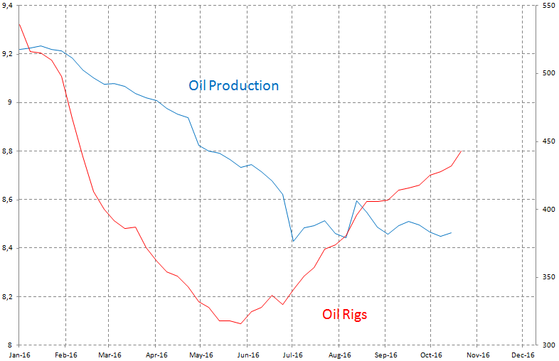 W poprzednim tygodniu otrzymaliśmy kolejną figurę obrazującą wyższy poziom aktywnych wież wiertniczych na polach z ropą w USA. Od czerwca bieżącego roku ich poziom wzrósł o grubo ponad 100 sztuk do powyżej 440 w chwili obecnej. Niemniej w analogicznym czasie produkcja surowca nie wzrosła, a ustabilizowała się. Potwierdza to, że nie mamy bezpośredniej i liniowej zależności między dwiema figurami. Wątek ten tłumaczyłem już w przeszłości. Aczkolwiek z biegiem czasu możemy zobaczyć presję wzrostową na produkcję w USA (tym bardziej, jeśli OPEC ograniczy produkcję) i jednocześnie spadki cen.