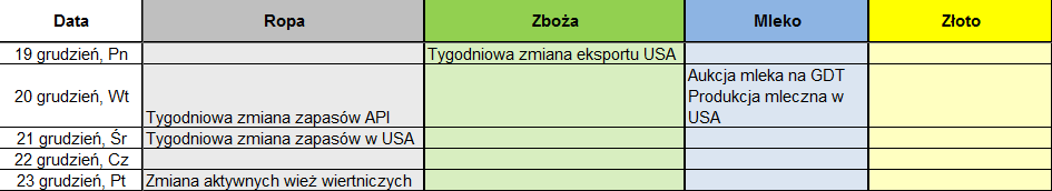 Poza tym czeka nas ostatnia w tym roku aukcja mleka na giełdzie w Nowej Zelandii. Tym samym warto obserwować notowania dolara nowozelandzkiego. W ostatnim czasie ceny surowca mocno odbiły, co może stanowić czynnik wspierający kiwi (NZDUSD) na początku przyszłego roku.