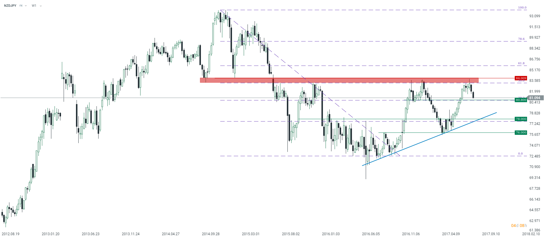 Drugą, godną rozważenia parą z dolarem nowozelandzkim jest NZDJPY. Z punktu widzenia wykresu tygodniowego istnieje wciąż przestrzeń do spadków, jeśli tylko niedźwiedziom uda się przełamać 80,8. Jeśli ta sztuka zakończy się powodzeniem, wówczas względnie szybko możemy znaleźć się w okolicy 78, gdzie przebiega również zniesienie 23,6% całej fali spadkowej zanotowanej od jesieni 2014 roku.