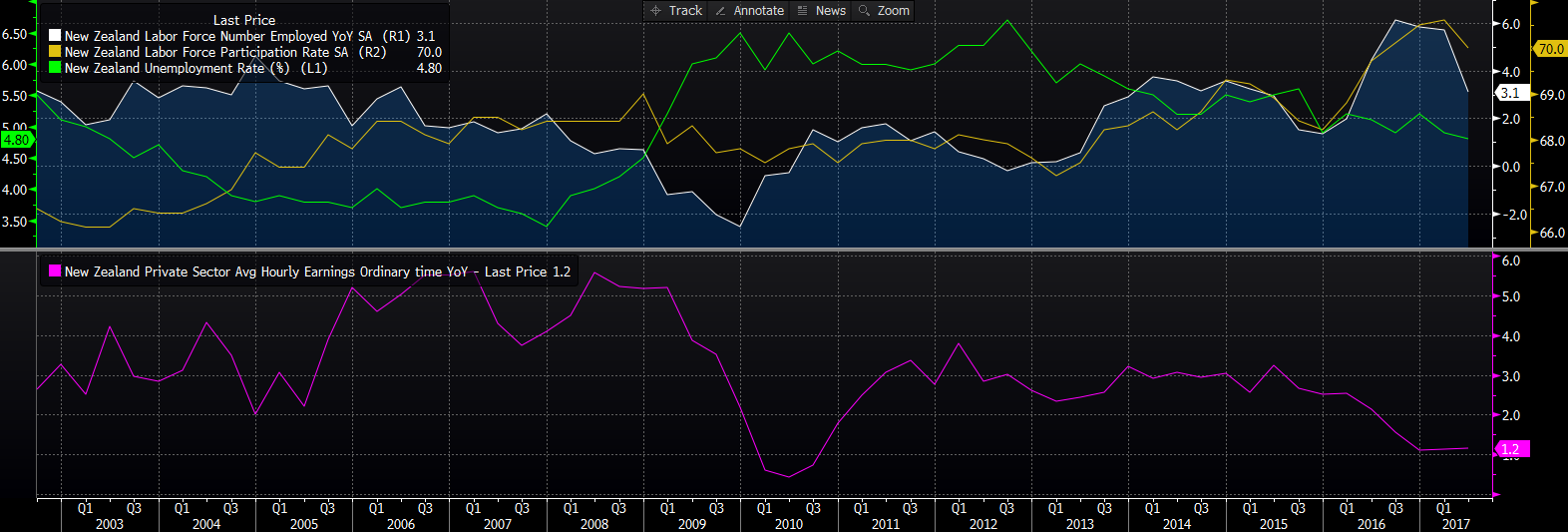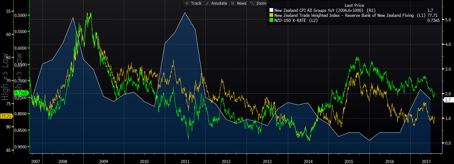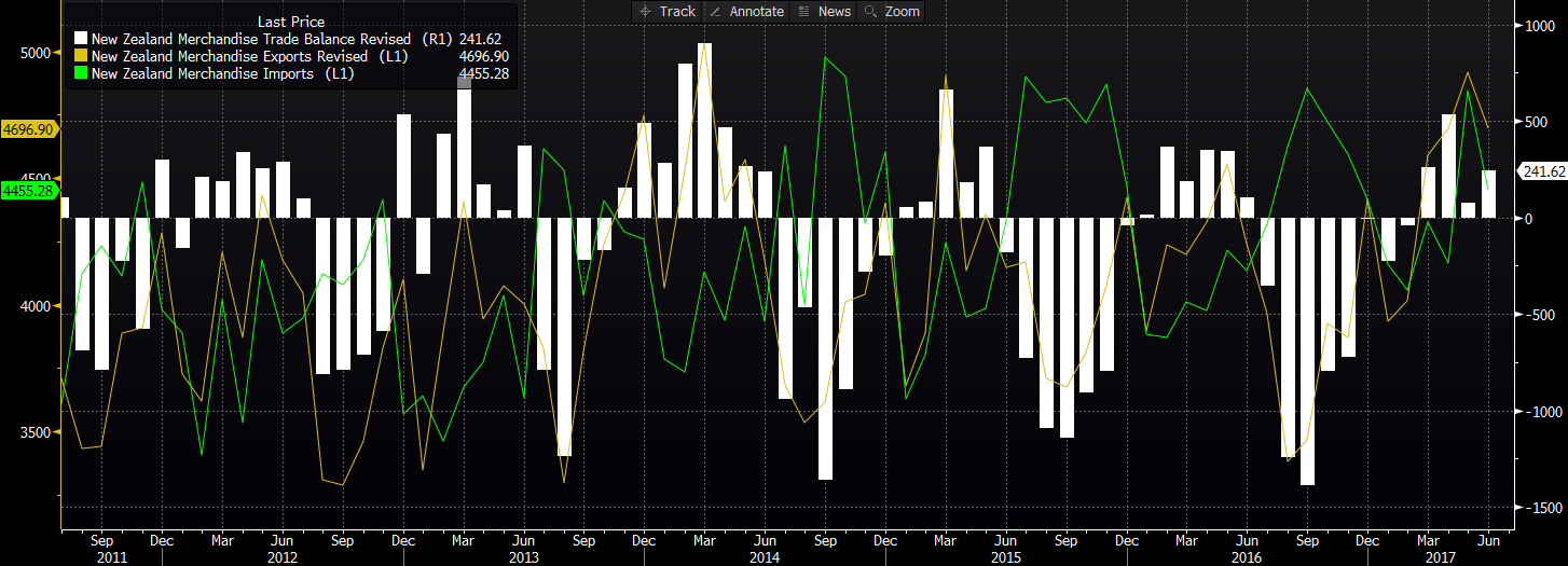 Spoglądając na powyższy wykres widać wyraźnie, że pierwsza połowa roku jest zdecydowanie lepsza dla Nowej Zelandii jeśli chodzi o wysokość nadwyżki handlowej. Tym niemniej, pomimo tego faktu, pierwsza połowa 2017 roku należała do jednych ze słabszych w ostatnim czasie (po części jest to efekt redukcji importu ze strony Chin). Zakładając, że sezonowość i w tym roku będzie utrzymana, druga połowa roku może oznaczać większe spadki bilansu handlowego Nowej Zelandii, co nie powinno być czynnikiem wspierającym NZD.