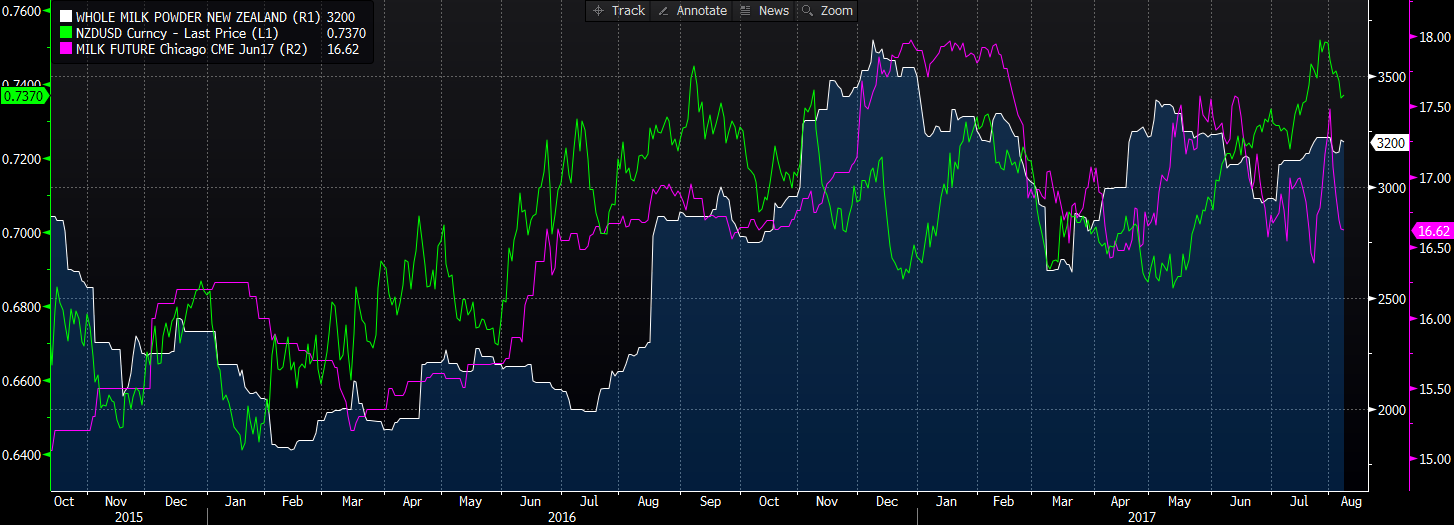 Kolejnym czynnikiem mogącym przemawiać za niższą wartością dolara nowozelandzkiego jest sytuacja na rynku głównego towaru eksportowego – mleka. O ile ceny pochodzące z dwutygodniowych aukcji GDT nie pokazały jeszcze istotnego spadku, notowania kontraktu terminowego na giełdzie w Chicago sugeruje już zdecydowanie niższą wartość NZDUSD. Tym samym od strony fundamentalnej wydaje się, że NZDUSD (choć nie tylko względem USD) jest zdecydowanie za wysoko, co może przemawiać za niższymi pułapami cenowymi w najbliższych tygodniach.