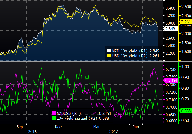 Na koniec rzut oka na rynek obligacji, który wciąż usilnie pokazuje potężne niedowartościowanie dolara amerykańskiego na szerokim rynku, względem NZD również. Choć z pewnością jest to czynnik mogący wspierać spadki kiwi w krótkim okresie, to w dłuższym okresie sądzę, iż nie będzie to kluczowy czynnik dla rynku walutowego. Aktualnie spread 10-letnich rentowności sugeruje poziom NZDUSD w okolicy nawet poniżej 0,70.