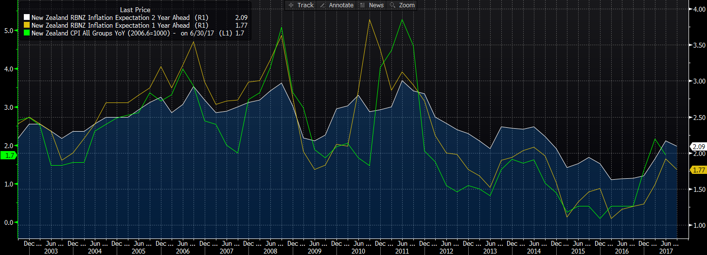 Poza tym na początku tygodnia poznaliśmy dane na temat oczekiwań inflacyjnych, które choć nie tak mocno, to obniżyły się względem poprzednich odczytów, co także nie powinno pomagać w odbiciu dynamiki cen. O ile podczas jutrzejszego posiedzenia kwestia ta nie powinna odgrywać tak istotnej roli, o tyle jeśli trend ten będzie kontynuowany, może to znaleźć się na świeczniku członków RBNZ podczas kolejnego posiedzenia. Niemniej jednak w kwestii sierpniowego posiedzenia władze monetarne w Nowej Zelandii z pewnością nie otrzymują wsparcia ze strony miar spodziewanej, przyszłej inflacji.