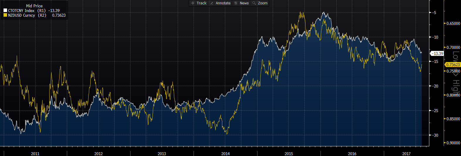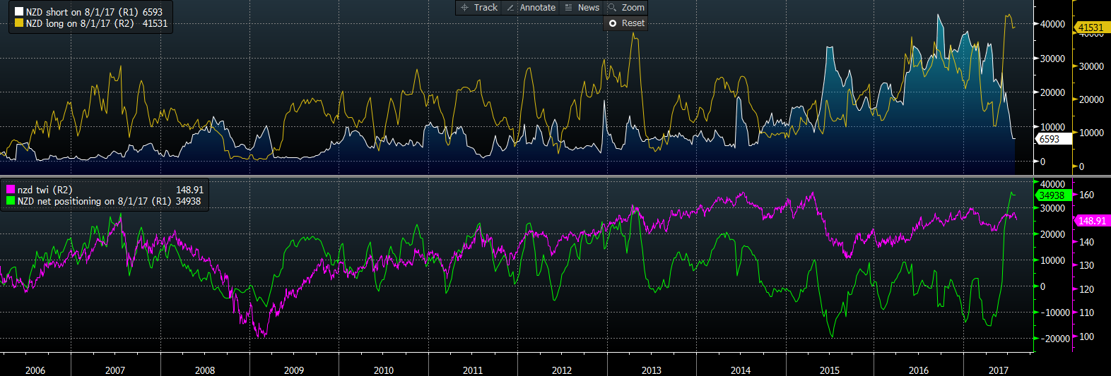 Kolejnym czynnikiem przemawiającym za możliwość przeceny NZD w następstwie posiedzenia RBNZ jest pozycjonowanie, które osiągnęło rekordowo wysokim poziom w ostatnim czasie. Jak widać poniżej, pozycje spekulacyjne netto wspięły się w oszałamiającym tempie w ostatnim czasie, co może wskazać na znaczące wykupienie rynku. Zatem, jeśli komunikat RBNZ wyraźnie wypunktuje zbyt wysoki kurs NZD, wówczas będzie szansa na odwracanie pozycjonowania.