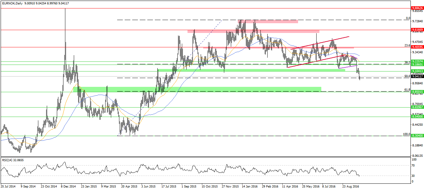 Ropa mocno rosła po tych doniesieniach, jednak równie imponujące wzrosty widoczne były na walutach skorelowanych jak CAD, MXN czy NOK. Właśnie ta ostatnia waluta przykuwać może większą uwagę. W ubiegłym tygodniu Norges Bank przyznał, że kolejne cięcia stóp procentowych raczej są mało prawdopodobne. Jeszcze wtedy nie zakładałem możliwego porozumienia w ramach OPEC. Opisywana w zalinkowanym wyżej wpisie strefa popytowa na USDNOK została naruszona, jednak większy ruch miał miejsce na EURNOK. Tutaj rynek już wyraźnie złamał ostatnią deskę ratunku dla byków. Tym samym zestawiając niechęć Norges Banku do cięcia stóp oraz ostatnie „rewelacje” ze strony OPEC możemy oczekiwać kontynuacji trendu spadkowego.