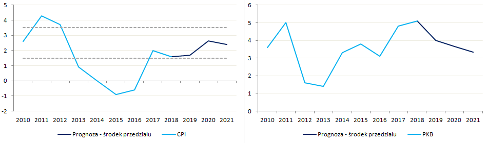 Jeśli chodzi o dynamikę PKB ta uległa lekkiej rewizji w górę do 4% z 3,55% w tym roku oraz do 3,65% z 3,25% w roku 2020 (również wartości dla środka przedziałów). Pierwsza projekcja na rok 2021 sugeruje dynamikę PKB także powyżej 3%. Na ten moment można jedynie domyślać się, że podniesienie szacunków wzrostu gospodarczego na ten i przyszły rok wynika w największym stopniu ze stymulacji fiskalnej (inne banki centralne obecnie rewidują prognozy wzrostu w dół). Pewną rolę mogła odegrać również kwestia braku podwyżek cen energii dla gospodarstw domowych (więcej szczegółów w poniedziałek). W kontekście pakietu fiskalnego bardzo cenna uwaga padła ze strony uczestniczącego w konferencji prasowej Jerzego Osiatyńskiego który powiedział, że założeniem szacunkowych wpływów budżetowych jest to, że gospodarka wciąż ma jeszcze pewien stopień wolnych mocy produkcyjnych.