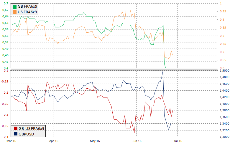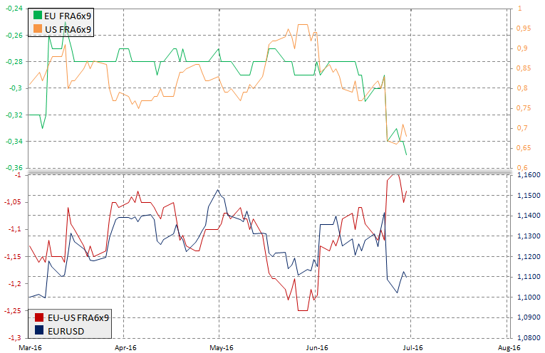 Na pierwszy ogień idzie rynek głównej pary walutowej. Jak widać na poniższej grafice, spread stawek FRA na 3-miesięczny LIBOR wskazuje obecnie na dużo wyższy poziom, aniżeli obecnie się znajdujemy. Niemniej należy zwrócić uwagę, że tuż po ogłoszeniu wyników referendum linie te zaczęły się zbliżać do siebie.