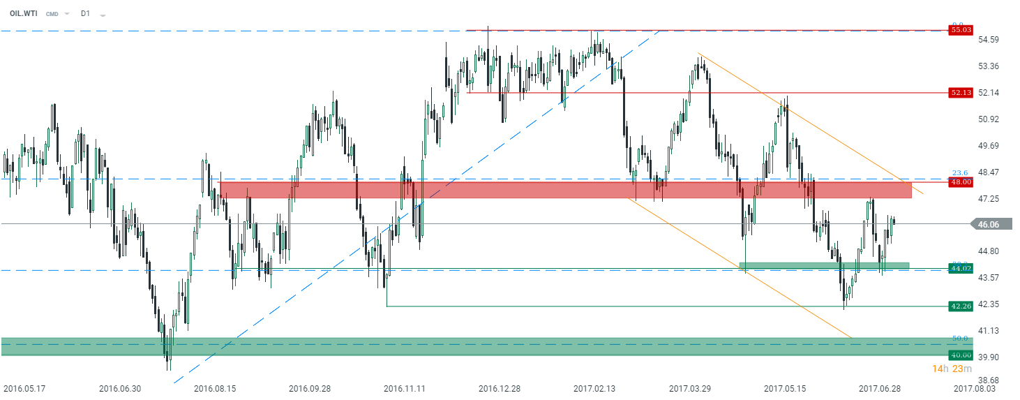 W ostatnich dniach poznaliśmy kilka ważnych raportów dla rynku ropy naftowej, które summa summarum okazały się względnie korzystne dla surowca, który notuje wzrosty od ważnego poziomu wsparcia zlokalizowanego w okolicy 44$. Niemniej jednak wynika to prawdopodobnie bardziej z kwestii technicznych, nie zaś fundamentalnych, gdyż te wcale nie zmieniły się diametralnie na korzyść kupujących. Warto jeszcze nadmienić, że w końcówce miesiąca producenci czarnego złota spotkają się w St. Petersburgu w celu oceny postępu swoich działań. Nie oczekuje się jednak jakichkolwiek zmian w sposobie implementacji samej strategii.