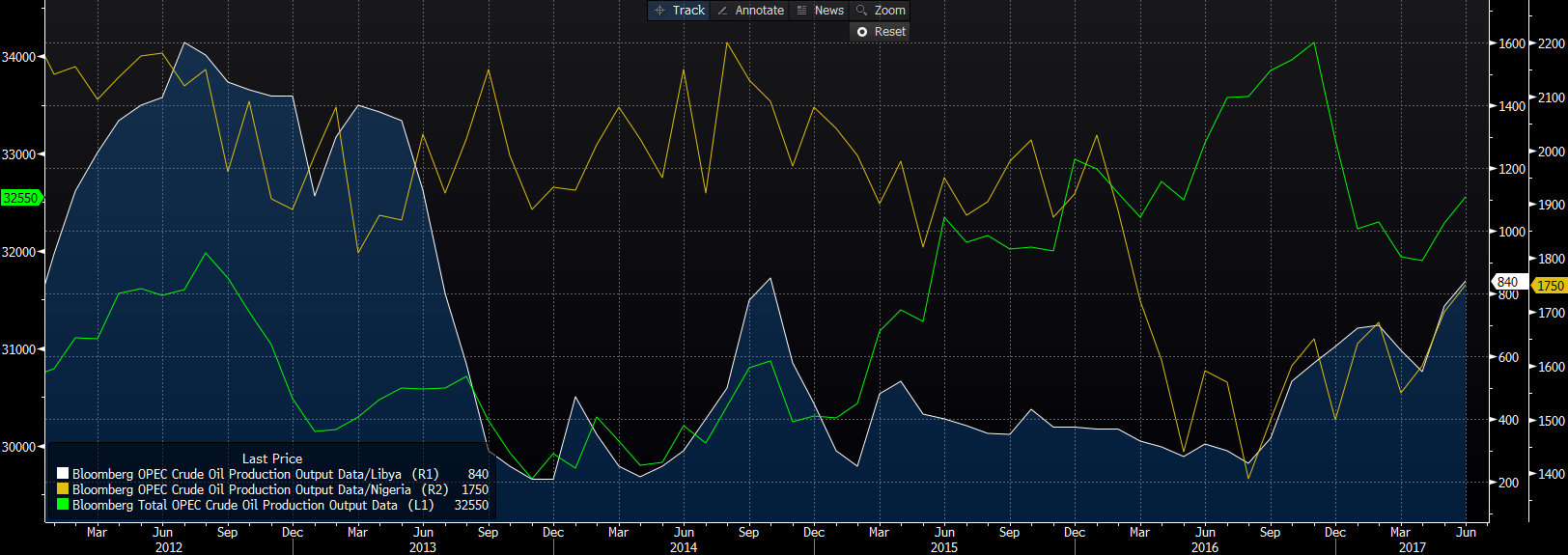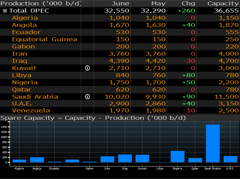 Tymczasem OPEC zdaje się nieco odbiegać od swojego porozumienia. Czerwcowa produkcja kartelu wzrosła łącznie o 260 kbpd w porównaniu z poprzednim miesiącem. Co najbardziej uderzające to fakt, że liderem wzrostów nie były kraje, które są wyłączone z paktu (Nigeria i Libia), a sama Arabia Saudyjska. Czołowy kraj OPEC zwiększył wydobycie o 90 kbpd. Poza tym warto zwrócić uwagę na pozostającą zdolność produkcyjną Arabii, która wynosi ponad 1,4 mbpd. Potencjalnie zatem kraj ten może produkować w tempie zdecydowanie przekraczającym 11 mbpd. Reasumując, poszczególne kraje OPEC, na czele z Arabią Saudyjską mają dużą zachętę, by zwiększać swoje wydobycie. Z drugiej strony obecnie poziomy cenowe wciąż nie wydają się adekwatne z ich punktu widzenia w długim terminie.