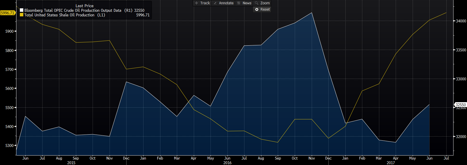 Z najważniejszych krajów tylko Wenezuela oraz Irak obniżyły swoją produkcję w ujęciu miesięcznym. Na dodatek OPEC prognozuje, że światowa konsumpcja surowca w przyszłym roku będzie mniejsza niż podaż (podobne wnioski do raportu EIA). Taki scenariusz był również obecny w pierwszej połowie bieżącego roku. Prócz tego prognozuje się, że w drugiej połowie roku globalna nadpodaż surowca ma spaść o 70 mln brl, co będzie oznaczać wciąż poziom ponad 160 mln brl powyżej 5-letniej średniej, będącej celem OPEC. Tak więc do końca roku nie ma mowy o zbilansowaniu się rynku, tak jak zakładano pod koniec zeszłego roku.