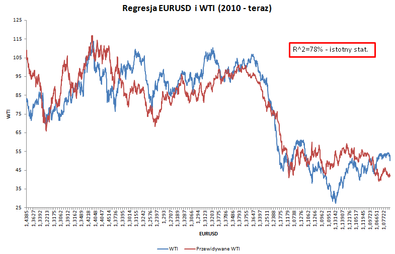 Na koniec chciałbym zwrócić jeszcze uwagę, jak bardzo notowania ropy uzależnione są od kursu dolara amerykańskiego (w poniższej analizie regresji wzięty kurs EURUSD, w przypadku czystego indeksu dolara dopasowanie modelu byłoby prawdopodobnie jeszcze wyższe).