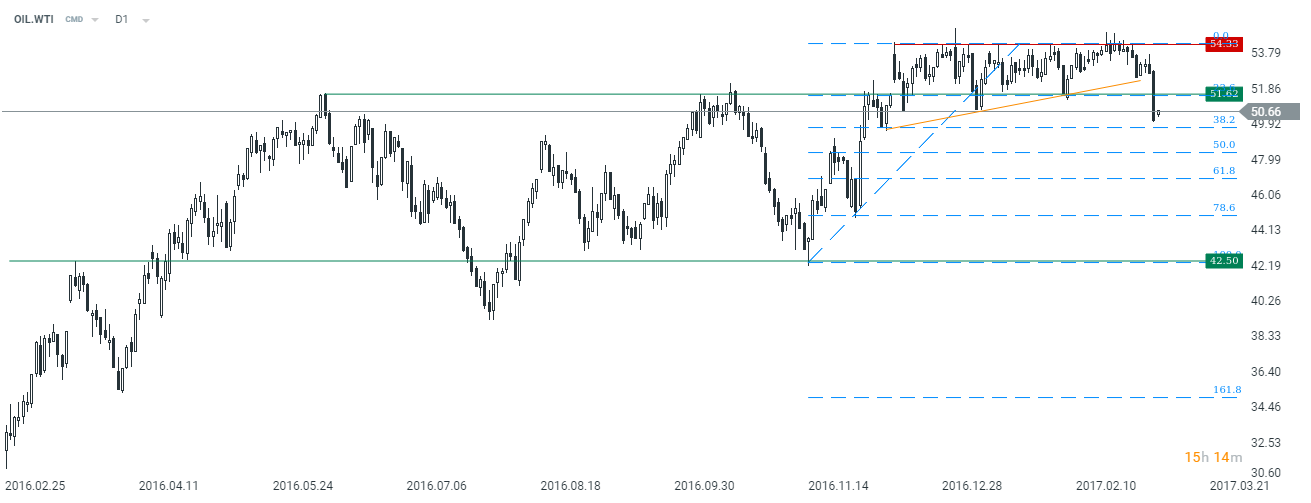 Niemniej jej tempo zdziwiło chyba wszystkich. W szczytowym momencie kontrakt na WTI osunął się o blisko -6%. Z drugiej strony należy podkreślić, że należało spodziewa się nawet wyższej wartości przyrostu zapasów, bowiem wtorkowy raport API pokazał ich wzrost o około 11 mln baryłek. Ponadto trend zarówno w rosnących zapasach surowca, jak i dynamice amerykańskiej produkcji w odpowiedzi na rosnącą liczbę aktywnych wież wiertniczych nie jest czymś nowym. Zachodzi więc pytanie dlaczego akurat teraz byki całkowicie skapitulowały?