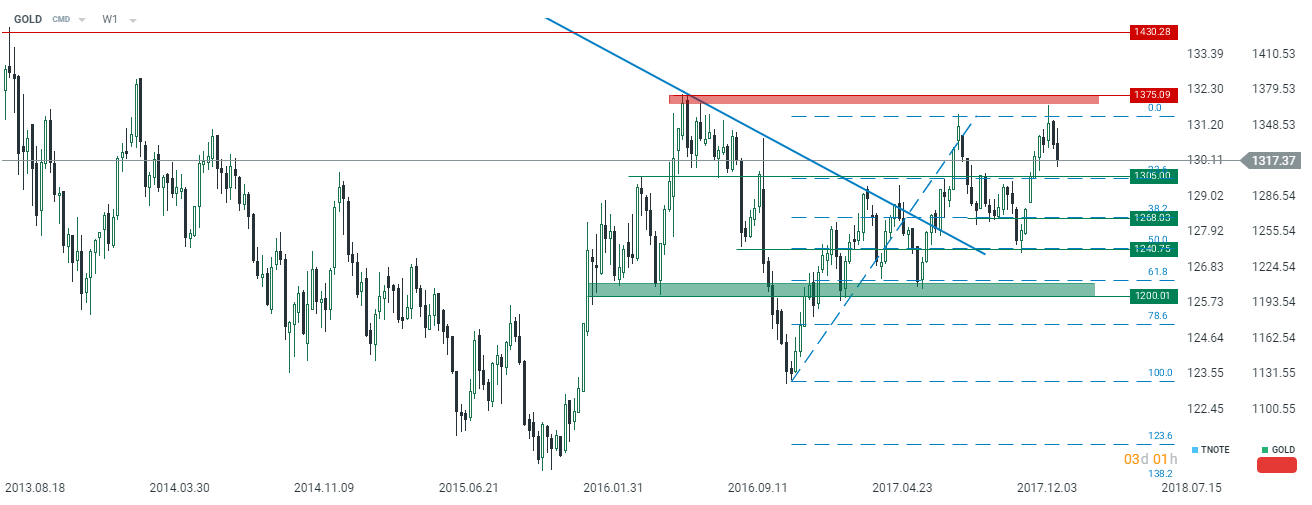 Choć ostatnie godziny skupiły się niemalże wyłącznie na globalnym rynku akcyjnym, to warto także przyjrzeć się nieco bliżej metalom szlachetnym, a konkretnie mam na myśli złoto, które było wyjątkowo stabilne pomimo tak silnego skoku zarówno zrealizowanej, jak i tej implikowanej zmienności. W międzyczasie poznaliśmy również raport autorstwa Światowej Rady Złota (WGC) za czwarty kwartał minionego roku pokazujący względnie optymistyczne liczby. Dla wszystkich zainteresowanych rynkiem żółtego metalu polecam również analizę poprzedniej publikacji tejże organizacji. Warto zauważyć, że od tego czasu notowania kruszcu wyraźnie wzrosły osiągając szczyt tuż poniżej kluczowej strefy podażowej. Trend ten był zgodny z listopadową analizą, która nie dawała większych szans na przebicie oporu zlokalizowanego na 1375$: