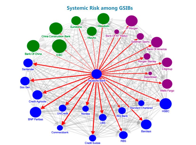 Jak widać na powyższej grafice Deutsche Bank i jego kondycja mają potężne znaczenie dla wielu kluczowych instytucji finansowych. Wielkości okręgów wskazują na rozmiary danych instytucji, zaś grubość strzałek na skalę połączeń między bankami. Zdaniem MFW Deutsche Bank stanowi główne źródło ryzyka systemowego dla europejskiego systemu bankowego. Mówiąc prościej, instytucjom na całym świecie będzie zależało na tym, by DB nie poszedł na dno, by nie było powtórki z 2008 roku z USA.