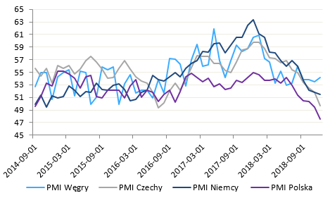 Według Markit przemysłowy indeks PMI w grudniu spadł do 47,6 z 49,5 w listopadzie, co oznacza drugi miesiąc z rzędu kurczącej się aktywności w tym sektorze gospodarki. Warto zauważyć, że skala spadków, choć nieco szokująca, zdaje się być wyjaśniana przez indeks z niemieckiego przemysłu (brzemię w postaci sektora motoryzacyjnego). Sytuacja słabo wygląda również w Czechach, zaś na Węgrzech ostatnie wartości PMI były względnie stabilne. Dane to obrazują, że polski przemysł z pewnością nie uniknie głębszego spowolnienia z uwagi na znaczne uzależnienie od eksportu. Tym samym sytuacja na zachodzie Europy, a przede wszystkim u naszych zachodnich sąsiadów, będzie z pewnym opóźnieniem przefiltrowywać się do Polski (na razie dynamika produkcji przemysłowej pozostaje względnie mocna na tle danych z krajów zachodniej Europy, choć trzeba nadmienić, iż do listopada włącznie była ona najsłabsza od 2014 roku).