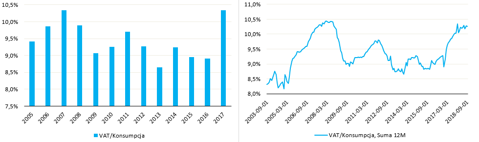 Na koniec chciałbym wspomnieć o skuteczności w ściągalności podatku VAT w ostatnich kwartałach, który to temat stał się dość medialnym w ciągu minionych tygodni. Choć dokładne oszacowanie tego, jaki odsetek wzrostu dochodów budżetowych z tytułu podatku VAT jest efektem poprawy efektywności ściągalności nie jest możliwe, to można budować różnego rodzaju wskaźniki próbujące adresować ten problem. Jednym z nich jest wielkości wpływów z VAT do wydatków konsumpcyjnych. W lewej części powyższego wykresu możemy zauważyć, iż wskaźnik ten mocno wzrósł w 2017 roku (z 8,9% do 10,3%), a skala tego wzrostu była wyraźnie większa w porównaniu z poprzednimi latami. Sam wzrost jest efektem świetnej koniunktury, jednak już jego skala to efekt poprawy w ściągalności podatku VAT.