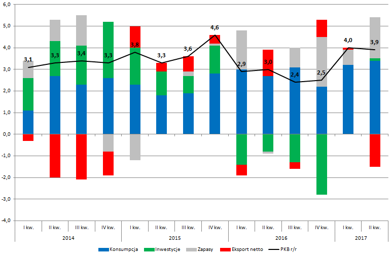 W ubiegłym tygodniu poznaliśmy szczegółowe dane na temat struktury wzrostu gospodarczego w Polsce, która była wyczekiwana już od momentu publikacji pierwszego szacunku PKB przez GUS. O ile sama dynamika została potwierdzona (3,9% r/r), o tyle szczegółowe dane mogą budzić pewne wątpliwości. Zaznaczyć trzeba w pierwszej kolejności, że zgodnie z oczekiwaniami to konsumpcja była największym motorem napędowym w drugim kwartale, zostawiając daleko w tyle inne składowe.