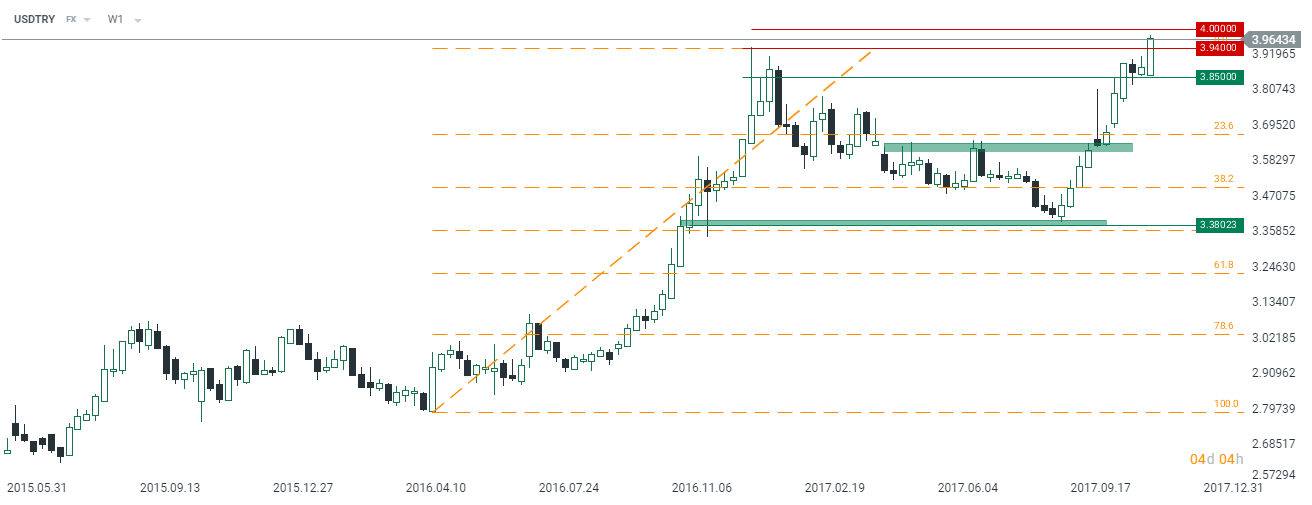 Choć z reguły nie zajmuję się walutami rynków wschodzących (naturalnie z wyjątkiem polskiej waluty), to sytuacja z jaką mamy do czynienia obecnie w Turcji jest zdecydowanie godna uwagi. Zacznijmy od podkreślenia faktu, że turecka lira (TRY) osłabiła się dzisiejszego poranka względem amerykańskiego dolara najmocniej w historii, zbliżając się niebezpiecznie w rejon okrągłego pułapu 4,00. O ile znajdujemy się już na rekordowo wysokich poziomach cenowych, wcale nie musi to oznaczać końca deprecjacji TRY.