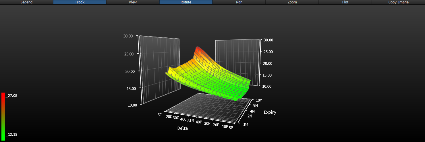 Mając na uwadze ostatnie ruchy na rynku tureckiej waluty w połączeniu z słabymi perspektywami nie jest niczym zaskakującym, iż traderzy na rynku opcji oczekują pokaźnych wzrostów USDTRY sukcesywnie wzdłuż całej krzywej, co zostało zobrazowane na wykresie powyżej. Wykres ten przedstawia implikowaną zmienność dla poszczególnej opcji PUT i CALL przy danym terminie, im wyższa zmienność tym wyższy popyt na daną opcję. Reasumując, najbliższa przyszłość tureckiej gospodarki nie mieni się bynajmniej w jasnych kolorach, co może w dalszym ciągu przyczyniać się do i tak już pokaźnej deprecjacji liry.