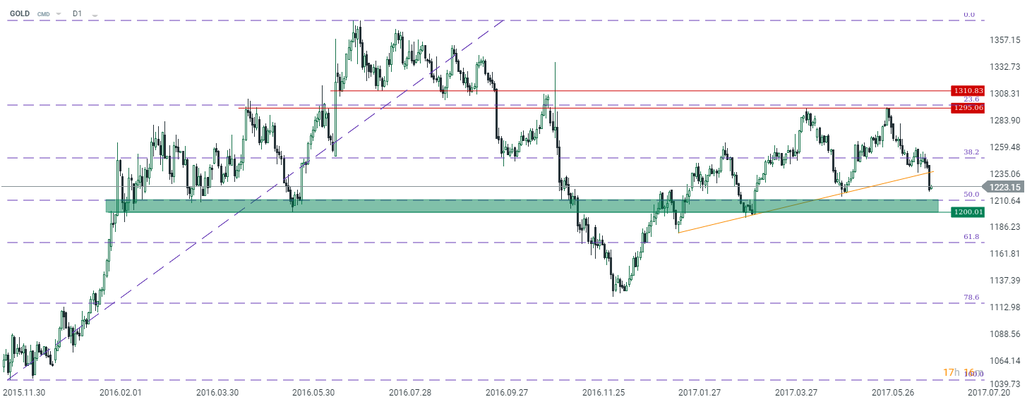 Patrząc na wykres cen złota z punktu widzenia interwału dziennego wydaje się, że interesującym poziomem do potencjalnych pozycji długich może być okolica strefy popytowej rozciągającej się między 1200 a 1210$. Właśnie w rejonie 1210$ przebiega również zniesienie 50% ruchu wzrostowego mierzonego od minimów osiągniętych pod koniec 2015 roku. Rejon ten w ostatnich miesiącach zapewniał już kilkukrotny powrót strony popytowej. Celem w średnim terminie pozostają okolice 1300$.