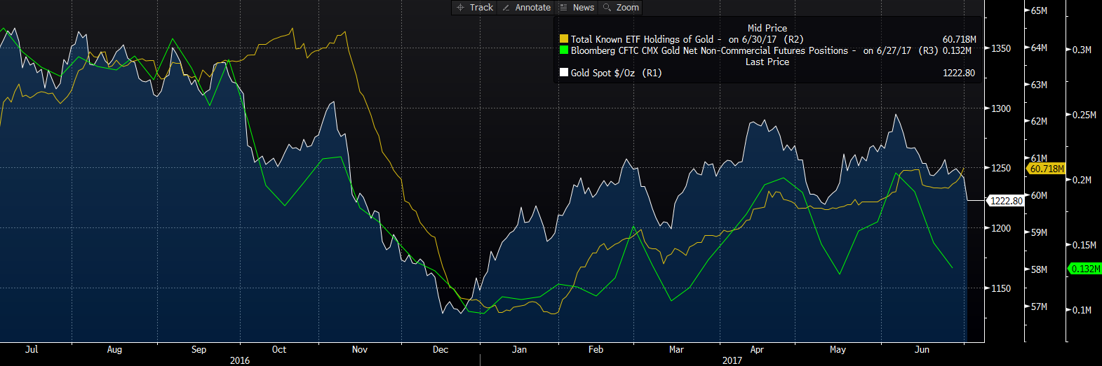 Innym aspektem, który w mojej ocenie nie wskazuje na większy trend spadkowy w cenie złota jest zachowanie funduszy ETF, które w ostatnich dniach zwiększały swoje zaangażowanie na rynku żółtego metalu, pomimo słabnącego impetu wzrostowego cen. Może to być odczytywane jako próba wykorzystania aktualnej korekty cenowej do zajmowania pozycji długich w średnim okresie.