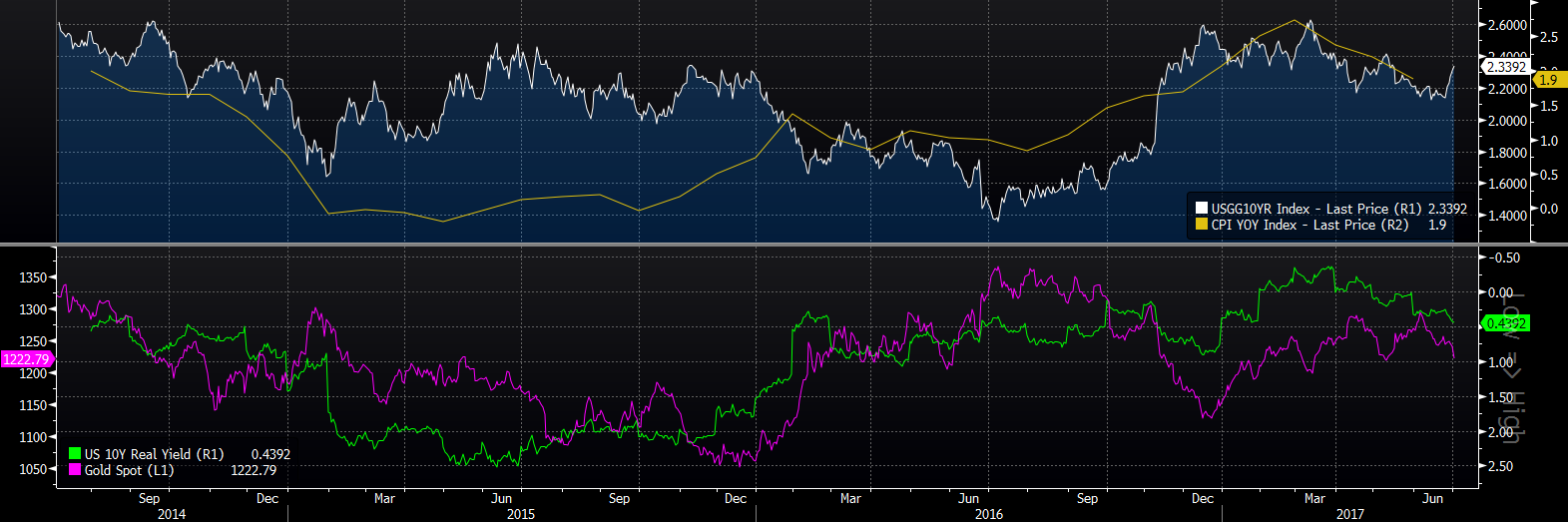 Aktualnie ponownie widzimy, że ceny złota zmierzają coraz bardziej na południe, co jednak nie jest odzwierciedlone w wyższej, realnej rentowności obligacji. Na tej podstawie uważam, że przestrzeń do spadków cen metalu jest ograniczona, gdyż nie oczekuję znaczącego wzrostu rentowności za oceanem. Sytuacja ta się może jednak zmienić do pewnego stopnia wraz z poprawą danych gospodarczych, wówczas inwestorzy na rynku długu mogą dawać większe nadzieje temu, że FED będzie kontynuował swój aktualny cykl monetarny.
