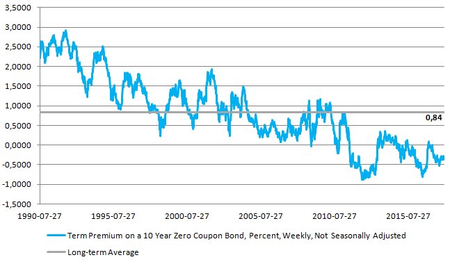 Na koniec wskażmy, że o ile premia terminowa w USA powinna w kolejnych miesiącach wzrastać, to trwały powrót powyżej długoterminowej średniej wydaje się mało realny z uwagi na fakt, iż FED zapewne nie zredukuje sumy bilansowej do poziomów sprzed kryzysu i choć Ministerstwo Skarbu prawdopodobnie ucieknie się do emisji obligacji z dłuższym terminem wykupu (wykorzystując względnie niskie stopy procentowe) w celu finansowania rosnącego deficytu, to popyt ze strony funduszy emerytalnych i innych instytucji, które muszą posiadać papiery z wyższą duracją powinien zrekompensować ten większą podaż. Poza tym, ograniczone wzrosty premii terminowej (powyżej zera) powinny wynikać również ze wzrostu rentowności na krótszym końcu krzywej w odpowiedzi na zapowiadane podwyżki stóp procentowych. Zatem sytuacja ta może powoli prowadzić do momentu, kiedy krótszy i dłuższy koniec krzywej dochodowości zrównają się wywierając negatywny wpływ na gospodarkę.