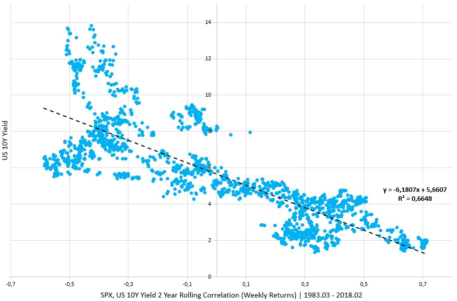 Wreszcie, wyższe stopy procentowe (rentowności obligacji rządowych) to jednocześnie wyższa stopa wolna od ryzyka, a zatem bodziec do inwestycji w bardziej ryzykowne aktywa spada, zwłaszcza przy dość drogich akcjach za oceanem. Na koniec wspomnijmy jeszcze o rosnących kosztach pracy (ostatni skok wynagrodzeń w USA mógł zostać po części wywołany warunkami pogodowymi stąd krytyczny wydaje się raport za luty), które w świecie coraz wyższej konkurencji może utrudniać przerzucanie kosztów na finalnego odbiorcę, a wynikiem tego mogą być niższe marże (przy jednoczesnym wzroście kosztu finansowania). Jak zatem zależność między rynkiem akcji, a obligacji wyglądała historycznie na przykładzie Stanów Zjednoczonych?