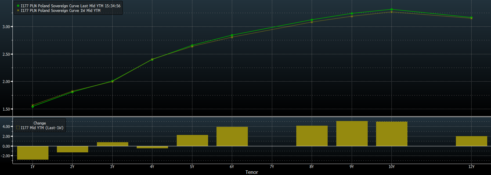 O ile na rynku opcyjnym nie widać były na przestrzeni ostatnich kilku dni bardziej zauważalnych zmian, o tyle rynek papierów dłużnych poniekąd zareagował. Obligacje z dłuższym terminem wykupu były wyprzedawane, podczas gdy inwestorzy zdecydowali przesunąć swój kapitał w stronę papierów z krótszym terminem zapadalności. W rezultacie cała krzywa uległa wypiętrzeniu. Z drugiej strony można zakładać, że trend ten jest w dużej mierze spowodowany przez czynniki globalne. Oczekiwania wyższego wzrostu globalnego sprawiają, że krzywe rentowności w wielu gospodarkach ulegają wypiętrzeniu, Polska nie była wyjątkiem.