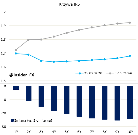 Pomimo niezłych danych makroekonomicznych i wyższej od konsensusu inflacji, rynkowe stopy procentowe w Polsce spadły znacząco w ciągu ostatnich kilku dniach. W konsekwencji powyższego, aktualnie w horyzoncie roku wyceniana jest już pełna obniżka stóp. Zarówno krzywa rentowności obligacji jak i krzywa IRS wypłaszczyły się zauważalnie, a ruch skoncentrowany był na dłuższych końcach krzywych ze względu na oczekiwaną słabość gospodarczą (ograniczenie oczekiwań inflacyjnych w długim terminie). Niemniej głównym winowajcą nie jest słabość polskiej gospodarki per se, ale szerzące się obawy związane z rosnącą liczbą zarażonych koronawirusem. Na początku tygodnia napłynęły informacje o szybko rosnącej liczbie przypadków we Włoszech, Iranie czy Korei Południowej, co diametralnie obiło się na wycenie aktywów (silna przecena akcji oraz potężny rajd na rynku obligacji skarbowych, w tym polskich papierów). W mojej ocenie ruch na krajowym rynku stopy poszedł jednak zdecydowanie zbyt daleko (przykładowo stawka 5-letniego IRS spadła dzisiaj do najniższego poziomu od sierpnia 2019) biorąc pod uwagę, gdzie znajduje się inflacja i jak póki co wygląda sfera realna gospodarki. Polska nie jest tutaj ewenementem, gdyż w USA rynek kontraktów terminowych na stopę funduszy federalnych wycenia obecnie ponad dwie obniżki do końca bieżącego roku. Osobiście uważam, że polityka pieniężna nie powinna być wykorzystywana dla zapobiegania skutkom szerzącej się epidemii chińskiego wirusa, który jest ewidentnie efektem podażowym (stąd aktualna wycena stóp jest według mnie dość irracjonalna).