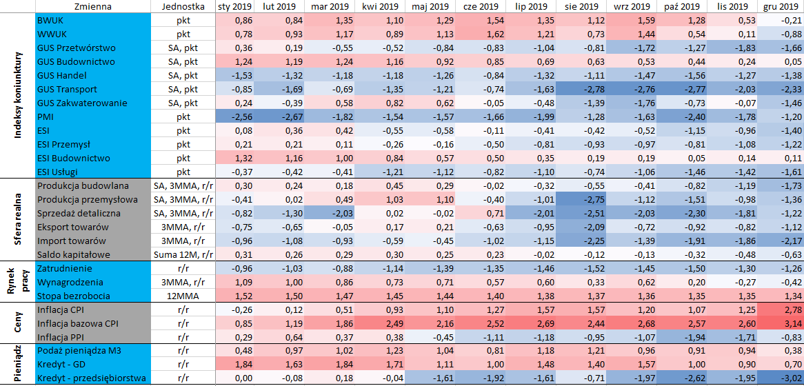 W grudniu po raz pierwszy publikowałem wyniki modelowania głębokiego spowolnienia gospodarczego w Polsce. Wówczas wskaźnik ten implikował relatywnie wysokie szanse na osiągnięcie takiego scenariusza, a od tego czasu sytuacja w kraju nie uległa większej zmianie. Miniony rok zakończyliśmy wyraźnym schłodzeniem aktywności gospodarczej przy jednoczesnym ożywieniu procesów inflacyjnych. Pozytywnym zaskoczeniem była struktura wzrostu gospodarczego w czwartym kwartale, która ukazała wysoką dynamikę wzrostu inwestycji w porównaniu do rynkowego konsensusu (mojej prognozy także). Styczniowe dane nie zaowocowały pojawieniem się punktu zwrotnego nad Wisłą. Jednocześnie w ostatnich kilku tygodniach zdecydowanie wrósł poziom ryzyk zewnętrznych, co istotnie pogarsza bilans ryzyk ogółem dla wzrostu gospodarczego w Polsce w 2020 roku.