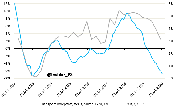 Na koniec chciałbym zwrócić jeszcze uwagę na jeden aspekt mówiący wiele o bieżącym i (prawdopodobnie) oczekiwanym spowolnieniem wzrostu gospodarczego w Polsce. Mowa o aktywności w transporcie kolejowym, która w ciągu ostatnich kilku kwartałów jakby zamarła. Według danych GUS ilość towarów przewiezionych tym środkiem transportu w ujęciu dynamicznym jest obecnie (stan na koniec stycznia) najniższa od początku 2013 roku. Historycznie zmienna tak względnie dobrze pokazywała kierunek dla dynamiki wzrostu PKB. Jeśli zatem i tym razem miałoby być podobnie można spodziewać się, że dynamika PKB w całym 2020 roku spadnie istotnie poniżej wzrostu potencjalnego, który obecnie szacuję na około 3,8% r/r. Taki stan rzeczy powinien tylko przyspieszyć proces domykania się luki popytowej, która ma szansę domknąć się niemalże całkowicie do końca bieżącego roku. Tak jak wspominałem wyżej, będzie to istotny aspekt dla RPP, która najpewniej pozostawi ustawienia polityki pieniężnej bez zmian w kolejnych kwartałach.