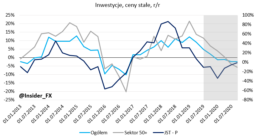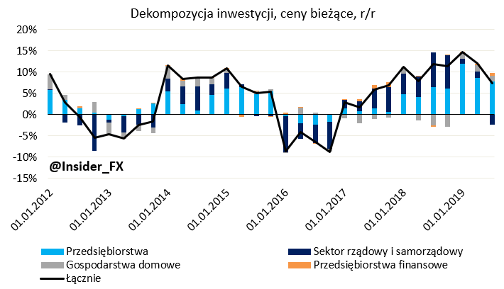 Tak się również składa, że dwa dni temu GUS opublikował szczegółowe dane w tym temacie za drugi i trzeci kwartał ubiegłego roku. Ogólny schemat został utrzymany, tj. dalsza zdecydowana słabość inwestycji sektora publicznego, do której jednak powoli zaczął dołączać sektor prywatny. Ten pierwszy w trzecim kwartale odnotował spadek o 8,4% r/r, zaś w przypadku inwestycji sektora prywatnego nastąpiło istotne spowolnienie dynamiki wzrostu do 6,6% r/r z 16,6% r/r w pierwszym kwartale 2019. Spoglądając na dekompozycję nakładów okazuje się, że ujemna kontrybucja sektora rządowego i samorządowego była najwyższa od końca 2016 roku, a to oznacza, iż inwestycje w trzecim kwartale były efektem już wyłącznie nakładów ze strony firm prywatnych. Patrząc z kolei na kompozycje inwestycji publicznych możemy zauważyć, że umiarkowanie negatywny wpływ miały wszystkie trzy krytyczne kategorie jak rząd, samorządy oraz pozostałe instytucje jak choćby KFD. Biorąc pod uwagę fakt, że to sektor publiczny najczęściej odpowiadał za pokaźniejsze zmiany nakładów na środki trwałe można dojść do wniosku, że krajobraz inwestycji ogółem nad Wisłą nie wygląda najlepiej w horyzoncie kilku kwartałów. Być może spore rozczarowanie nastąpi już po danych za czwarty kwartał roku poprzedniego. Z drugiej strony z samorządów, których inwestycje stanowią około 10-15% nakładów ogółem, napływają nie aż tak dramatyczne informacje jak mogłoby się wydawać.