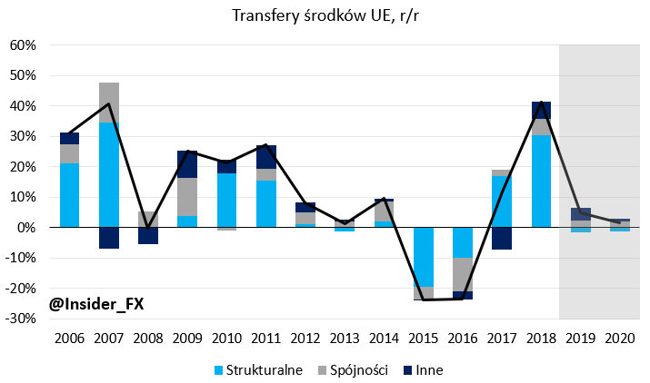 Jeśli chodzi o inwestycje sektora publicznego, który odpowiada za około 25% inwestycji ogółem, dużą rolę odgrywa również kwestia funduszy europejskich, która to zmienna dość dobrze opisuje zmiany dynamiki inwestycji JST. Pewien pogląd na tę kwestię można otrzymać spoglądając na dane o bilansie płatniczym, a konkretnie na saldo rachunku kapitałowego, które w polskich realiach oddaje w bardzo dużym stopniu skalę napływu środków unijnych. Na tym polu nie można być nadmiernym optymistą, gdyż po listopadzie roczna dynamika wzrostu tego salda spadła poniżej zera implikując słabość inwestycji publicznych, a i tych na poziomie zagregowanym. Jak dotychczas poznaliśmy dane za jedenaście miesięcy minionego roku jeśli chodzi o transfery środków unijnych. Według mnie prosta ekstrapolacja bieżącej dynamiki wzrostu nie jest słusznym podejściem, gdyż w minionych latach grudzień owocował zazwyczaj znacznie wyższym napływem kapitału z UE. Na tej podstawie zakładam, że i tym razem będzie podobnie, a łączne saldo środków unijnych zamknie się na poziomie 16,5 mld euro. W ujęciu dynamicznym oznaczałoby to spadek do około 5% r/r wobec 41,3% r/r w 2018. Takie założenie współgra również ze znacznym zahamowaniem inwestycji JST w 2019 roku wobec roku poprzedniego, gdzie zanotowano imponujący wzrost o 52,5% r/r. Prognozuję, że w całym 2019 roku dynamika inwestycji JST mogła spaść o około 5% r/r. Z kolei w roku 2020 spodziewam się w dużej mierze stabilizacji lub tylko umiarkowanego pogorszenia na tym polu. Nie oznacza to jednak, że ścieżka w całym roku będzie płaska. Spodziewam się, że pierwsza połowa nowego roku przywita nas pogłębionym spadkiem inwestycji JST, po czym nastąpi stopniowa stabilizacja.