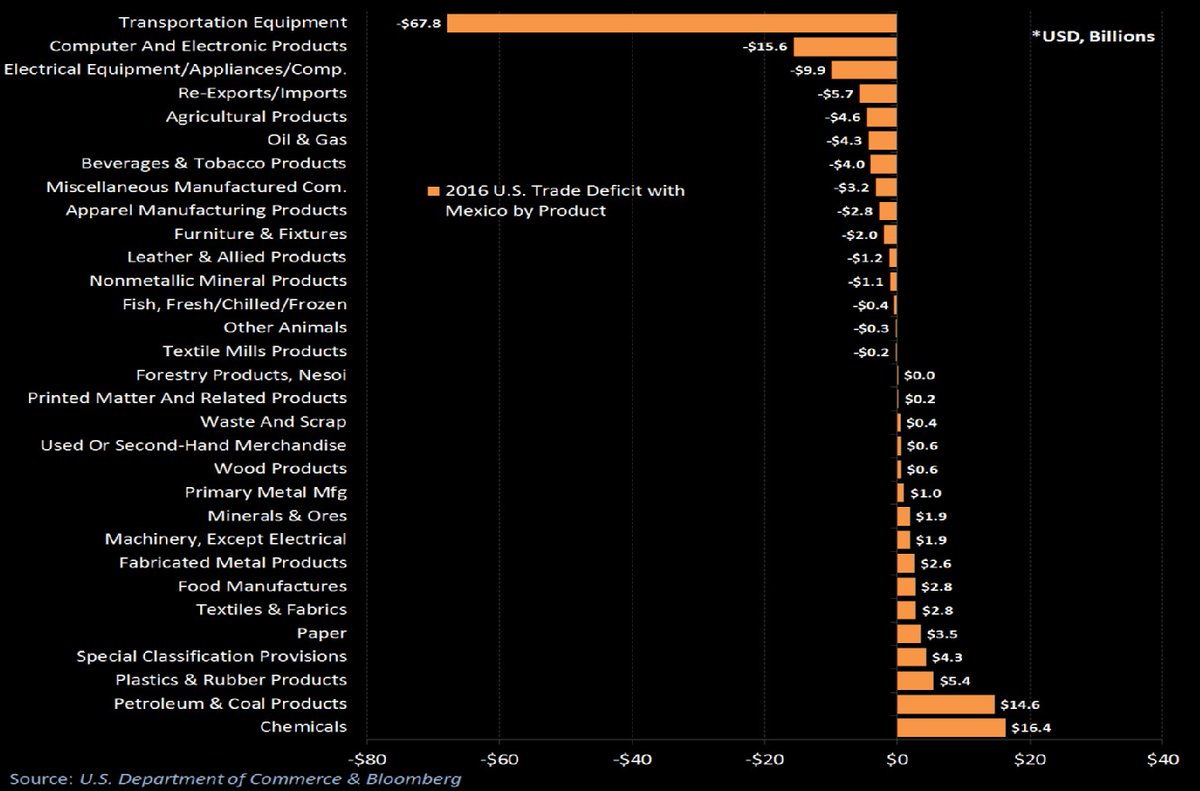 Dzisiejszego ranka pojawiły się informacje, jakoby zgodnie z wypracowanym porozumieniem między USA i Meksykiem ten pierwszy kraj miał prawo nałożenia 25%-owego cła na importowane od Meksykanów auta i części, jeśli ilość ta przekroczy pewne poziomy. Ściślej mówiąc, kiedy wielkość zaimportowanych pojazdów z Meksyku przekroczy poziom 2,4 miliona, wówczas administracja Donalda Trumpa będzie miała prawo nałożenia ww. obciążenia. Warto jednak dodać, że ilość ta tyczy się jedynie aut osobowych oraz SUV-ów, których łączny eksport do USA w zeszłym roku osiągnął około 1,8 miliona. Poza tym dodatkowe cła będą mogły być także nałożone na importowane części, kiedy już łączna wartość importu tego rodzaju produktów przekroczy 90 mld USD. Taki obraz rzeczy sprawia, że amerykańscy producenci aut zaczynają się obawiać, że polityka protekcjonistyczna może dramatycznie podbić ceny aut i zredukować popyt. Warto również dodać, że do wielkości 2,4 mln importowane pojazdy do USA, które nie spełnią bardziej rygorystycznych norm co do zawartości części produkowanych w krajach NAFTA, będą obciążone cłem w wysokości 2,5%. Z kolei powyższe zestawienie jasno wskazuje, jak znaczącym sektorem dla Meksyku jest transport i związane z nimi kategorie.