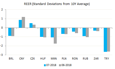 Biorąc pod uwagę fakt, że ryzyko związane z porozumieniem NAFTA było jednym z najbardziej ciążących czynników na meksykańskim peso wydaje się, że waluta ta może złapać więcej wytchnienia w najbliższym czasie, o ile finalne (satysfakcjonujące Meksyk) porozumienie zostanie wypracowane. Bazując na danych BIS na koniec lipca niedowartościowanie MXN wyraźniej zmalało, co było między innymi podyktowane słabszą postawą USD, ale i również nadziejami co do postępu w negocjacjach handlowych. Mimo wszystko peso pozostaje wciąż ponad jedno odchylenie standardowe poniżej swojej 10-letniej średniej, będąc najbardziej niedowartościowaną walutą rynków wschodzących (w świetle powyższego zestawienia) wykluczając turecką lirę. Ponadto, w bezpośrednim starciu z TRY meksykańska waluta wygrywa w kwestii poziomu zadłużenia zagranicznego. Na koniec 2017 roku zadłużenie zagraniczne brutto Meksyku wyniosło 38% PKB, podczas gdy Turcji 53,3% PKB. W obliczu rosnących dolarowych stóp procentowych czynnik ten musi być brany pod uwagę.
