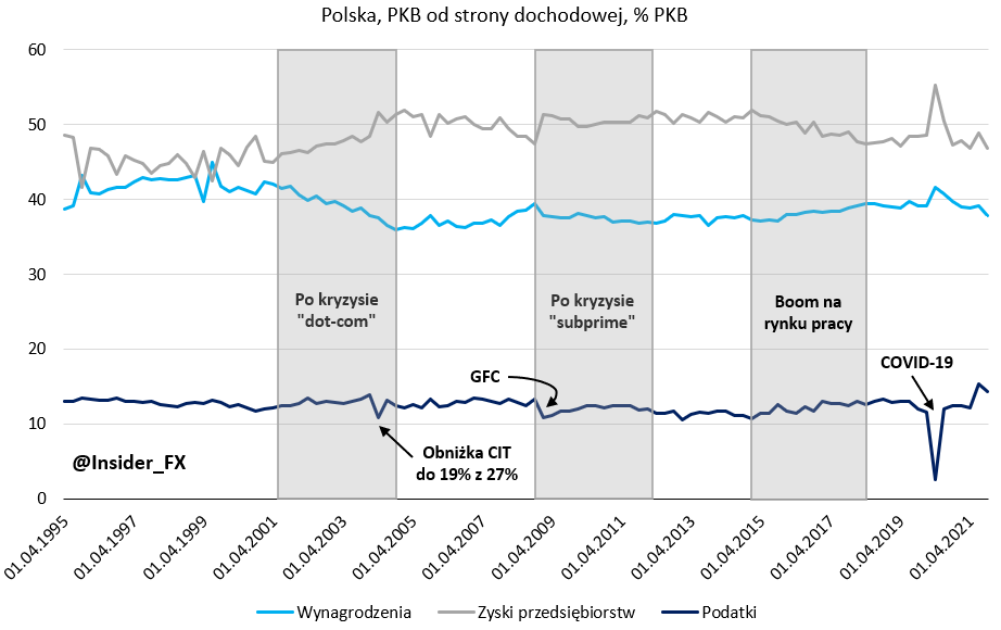 W międzyczasie warto również odnotować istotną obniżkę podatku CIT jaka miała miejsce w 2004 roku. Na wykresie dobrze wdać, że ubytek dochodów podatkowych ze strony sektora publicznego został zrekompensowany wzrostem dochodów przedsiębiorstw (transfer dochodu). Jednocześnie należy zauważyć, że od 2005 roku, aż do kolejnego kryzysu, obserwowaliśmy stopniowy wzrost udziału płac w PKB kosztem zysków firm. Sytuacja ta korespondowała z poprawą na rynku pracy, gdzie stopa bezrobocia spadła z okolic 18% w rejon 10%.