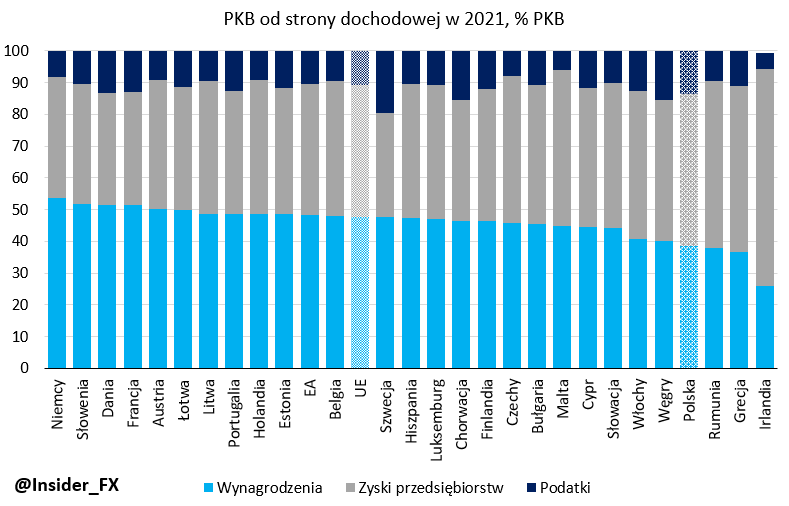 Podział PKB między pracowników, sektor przedsiębiorstw oraz rząd w krajach UE, źródło: Eurostat, InsiderFX Research