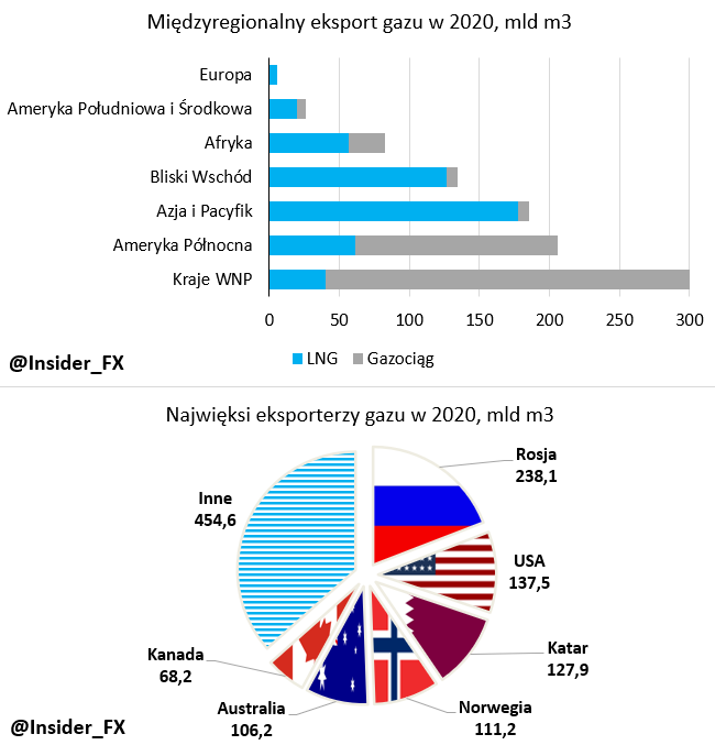 W zestawieniu międzyregionalnym liderem pozostają państwa WNP, gdzie ponownie palmę pierwszeństwa dzierży Rosja. Z tego powodu lwią część eksportu z tego regionu stanowi przesył gazociągami. Moskwa jest również jedynym krajem WNP eksportującym gaz w postaci LNG. W dalszej części zestawienia znajdziemy Amerykę Północną, gdzie także większość eksportu odbywała się za pomocą gazociągów. Sytuacja jest z kolei zdecydowanie odmienna w Azji i Pacyfiku oraz na Bliskim Wschodzie, gdzie główną formą eksportu w 2020 roku był LNG. Tutaj mówimy głównie o takich państwach jak Katar, Australia czy Malezja. Afryka także odpowiadała za sporą część eksportu gazu przed dwoma laty. Tutaj również skupiamy się na skroplonej postaci gazu, a głównymi graczami pozostają Nigeria i Algieria. W tym ujęciu ponownie na szarym końcu znajduje się Europa ze śladową ilością eksportu gazu.