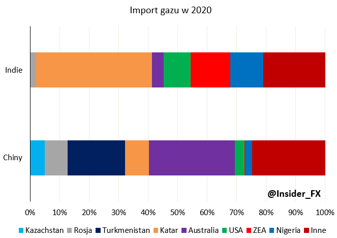 Indie zapotrzebowanie na gaz zaspokajają głównie z Kataru i w mniejszej części ze Zjednoczonych Emiratów Arabskich (ZEA), Nigerii czy USA. Kraj nie importuje gazu za pomocą gazociągów, a jedyną formą pozyskania surowca jest LNG. Import surowca z Rosji w 2020 roku w tej formie był śladowy i wyniósł zaledwie 0,7 mld m3. Tym samym wydaje się, że Rosja znaczną część swojego LNG mogłaby przekierować właśnie w stronę Indii.