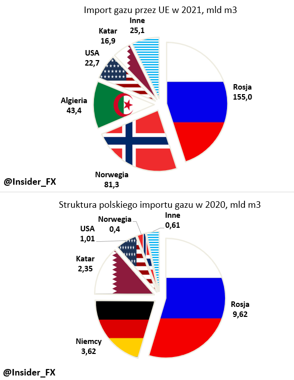 W 2021 roku Unia Europejska zaimportowała 155 mld m3 rosyjskiego gazu, tj. 45% całości importu. Całkowita wielkość importu gazu przez kraje UE w ubiegłym roku wyniosła ponad 344 mld m3. Po Rosji, drugim największym dostawcą była Norwegia z wynikiem ponad 81 mld m3, a trzecie miejsce przypadło Algierii. Spory import pojawił się także z USA i Kataru, których rola powinna w kolejnych latach istotnie rosnąć. Warto nadmienić, że 80 mld m3 importu UE to LNG, co pokazuje, że już w ubiegłym roku stanowiło to 23% całości importu. W kolejnych latach UE planuje zdecydowanie zwiększyć import gazu z USA, Kataru, a także państw Afryki.